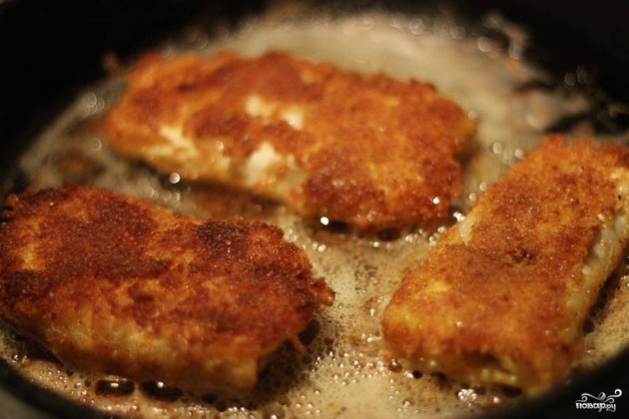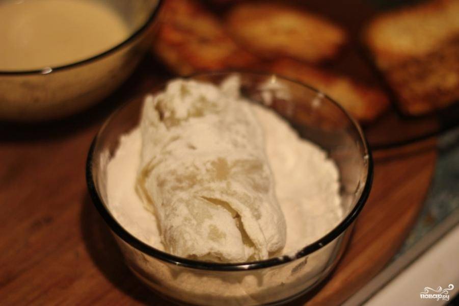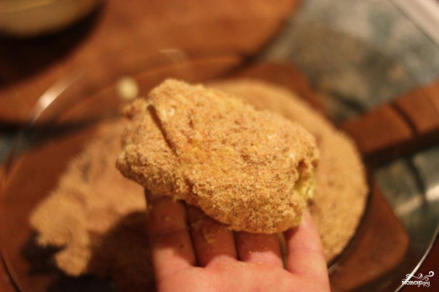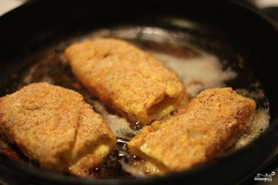 Обмакнуть конвертик в смесь, сделанную из сметаны, куркумы, кориандра и соли, а затем обвалять в панировочных сухарях. Конвертик готов для жарки. Сделайте так со всеми конвертиками.