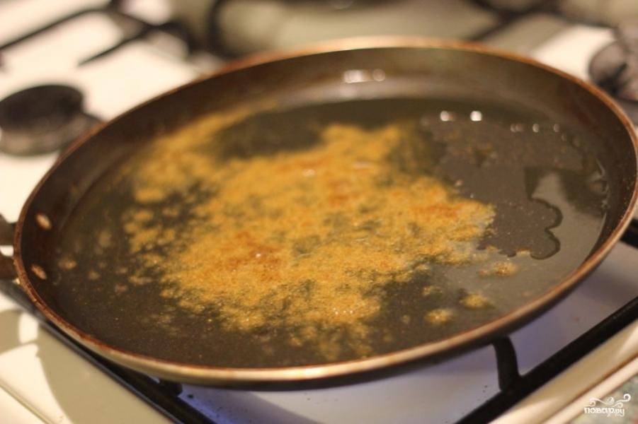 Первое что нужно сделать, это поставить вариться половину кочана капусты в соленной воде. В это время в сковородке разогреть масло, добавить карри и черный перец. Слегка их поджарить.