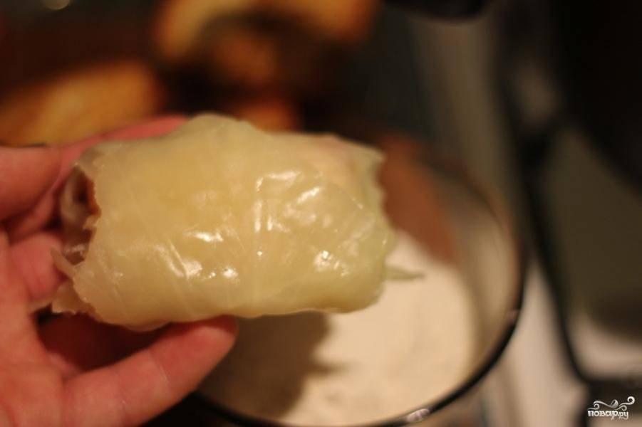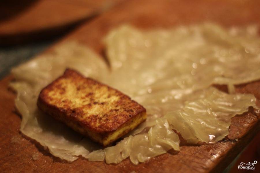 Сваренный кочан разделить на отдельные листья, слегка отбить каждый лист в местах сгиба и завернуть в него обжаренный сыр.