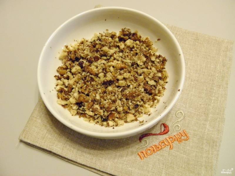 Очищенные орехи измельчите в ступке или просто порубите ножом. Добавьте их к печенью. Перемешайте.