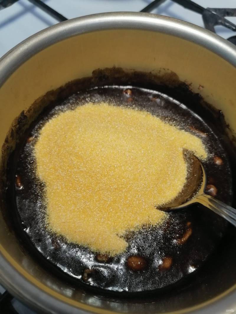 Затем в кипящую массу высыпаем поленту "Bravolli" все время помешивая. Варим примерно 5 минут, до густого состояния. Затем даем остыть.