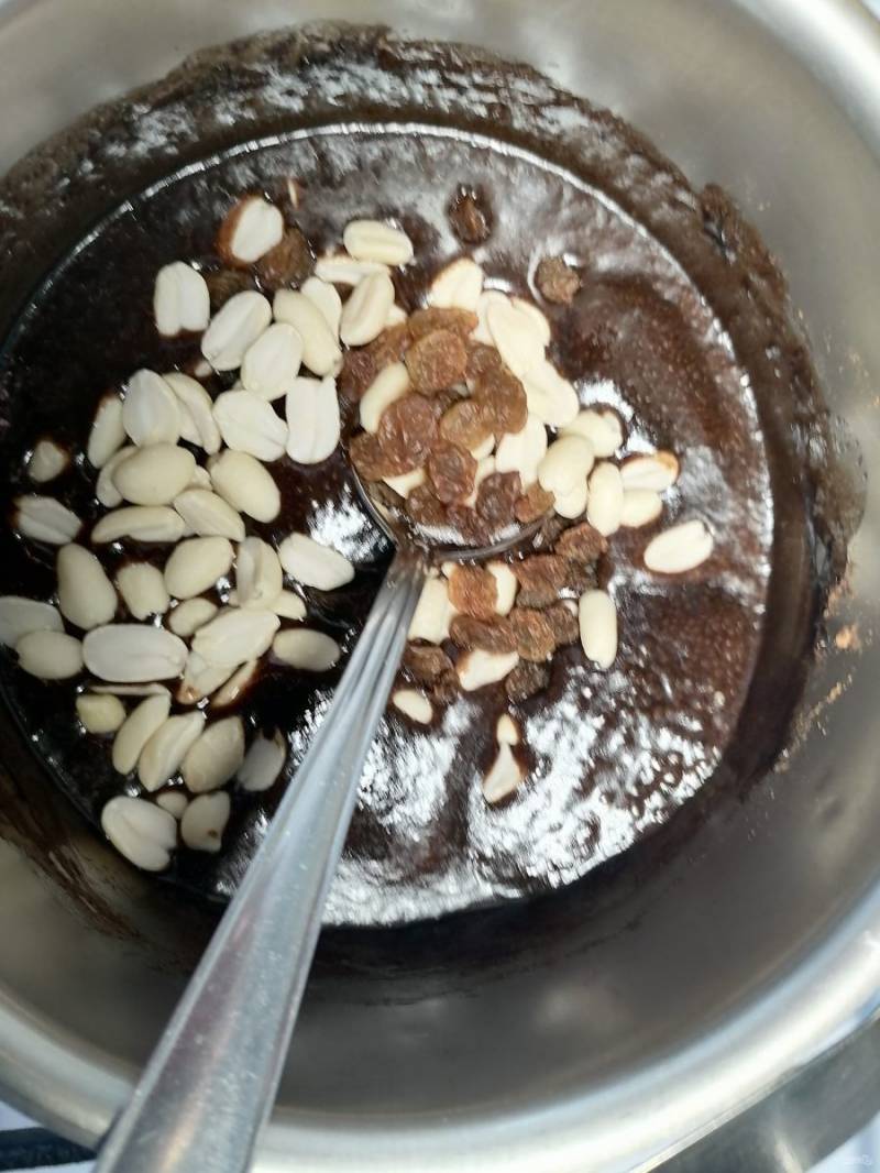 Кладем орехи и изюм, и доем прокипеть пару минут. Если будете класть грецкие орехи, то их лучше поломать на кусочки.