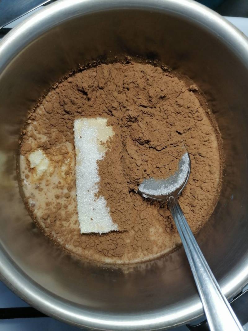 Наливаем в кастрюльку молоко, кладем масло, сахар, какао и доводим массу до кипения, все время помешивая.