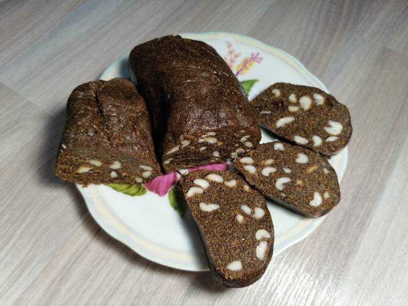 После того как колбаска остынет, нарезаем ее и подаем к столу! Очень вкусно с горячим кофе!