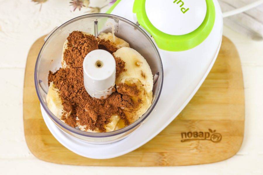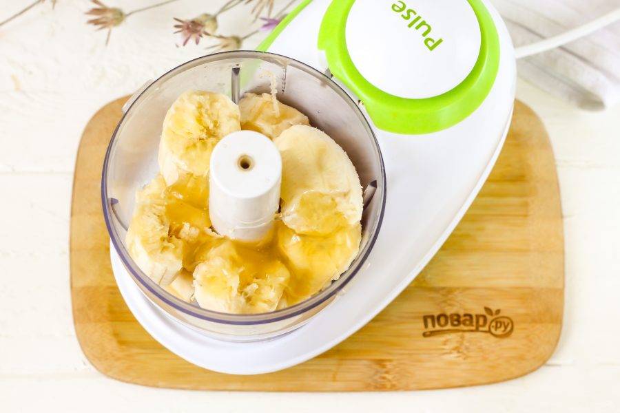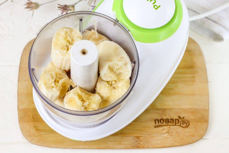 Бананы очистите от кожуры, нарежьте кружочками и выложите в чашу блендера или кухонного комбайна. По желанию можно дополнить бананы мякотью авокадо.