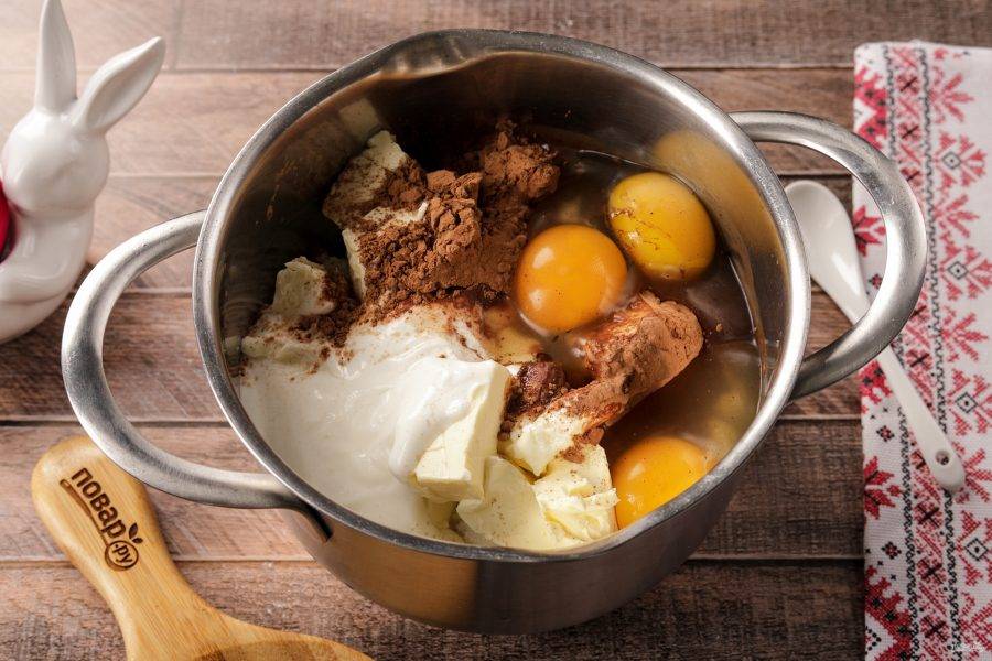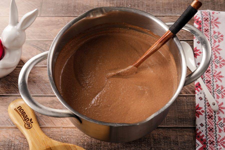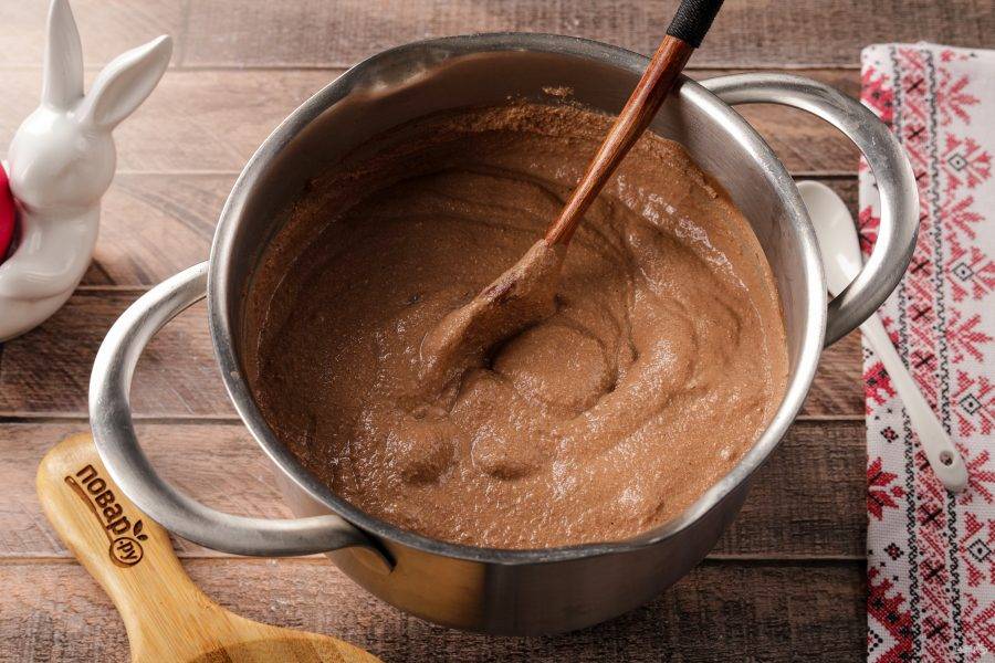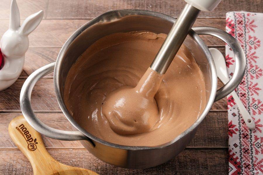 Поставьте будущую шоколадную пасху на плиту и варите её, постоянно мешая, на среднем огне до первого булька. Как только сахар и масло растворятся, смесь станет намного жиже. Однако в процессе термической обработки она будет постепенно густеть и вернет свою прежнюю консистенцию. Точно по времени я едва ли скажу, сколько держать на плите шоколадную смесь, поэтому ориентируйтесь на первый бульк. То есть не нужно дожидаться, пока все содержимое активно закипит — нужно дождаться лишь начало этого кипения. Дайте заготовке остыть до теплого состояния.