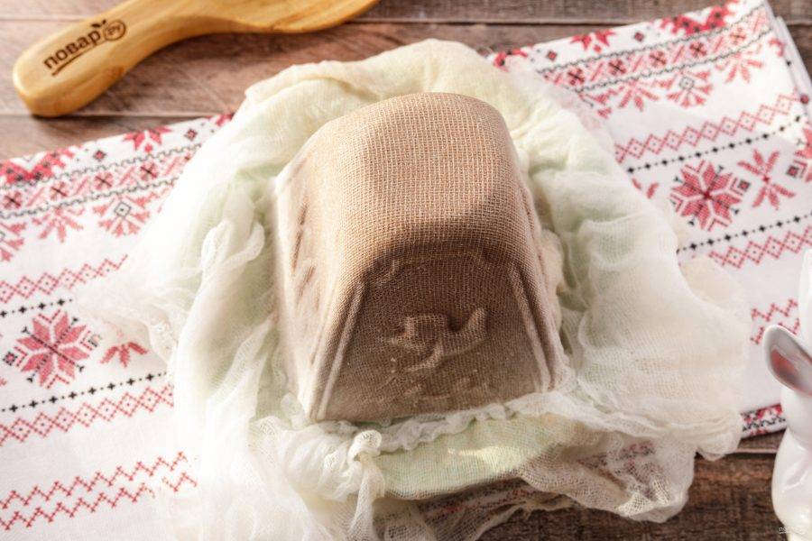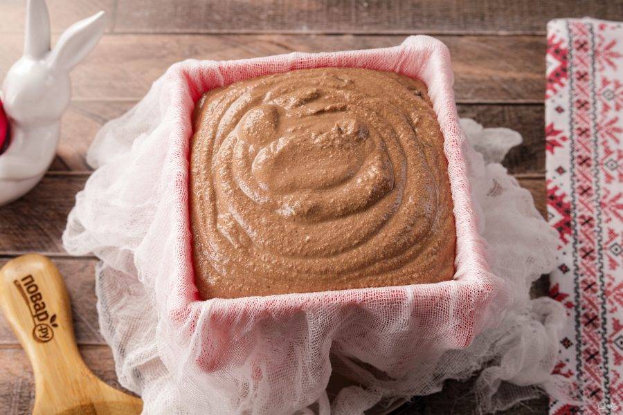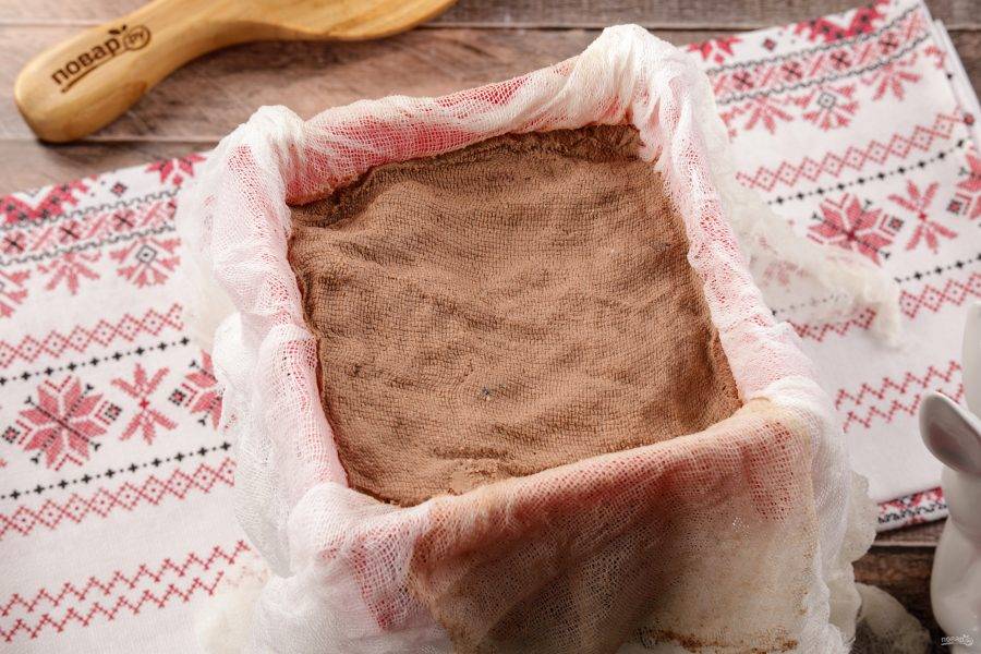 Эта заварная пасха будет готова очень быстро, если сравнивать с другими видами этого творожного десерта. Как проверить готовность? Прежде всего, сыворотка будет отходить все медленнее, кроме того, можно просто убрать груз, раскрыть марлю и потрогать шоколадную массу. Если она достаточно твердая (особенно в центре), все готово.
