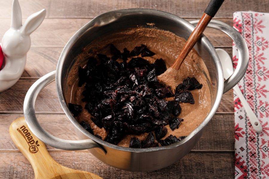 Тем временем подготовьте чернослив. Вес я указываю без косточек (если есть, удалите их). Жесткие сухофрукты нужно обязательно запарить кипятком и оставить минут на 5-10, чтобы чернослив стал пластичным, при этом не раскис. Мягкие сухофрукты просто помойте и обсушите, после чего нарежьте мелкими кусочками произвольной формы. Переложите измельченный чернослив в уже практически остывшую шоколадную заварную основу.
