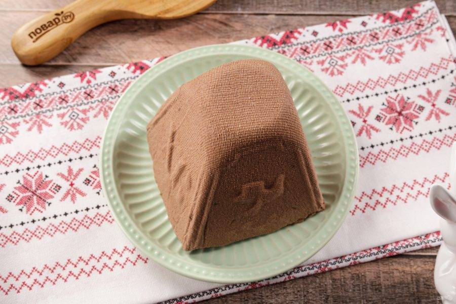 Положите поверх плоскую тарелку, на которой будете подавать шоколадный десерт на Пасху. Переверните на неё конструкцию (вместе с пасочницей). Аккуратно удалите форму.