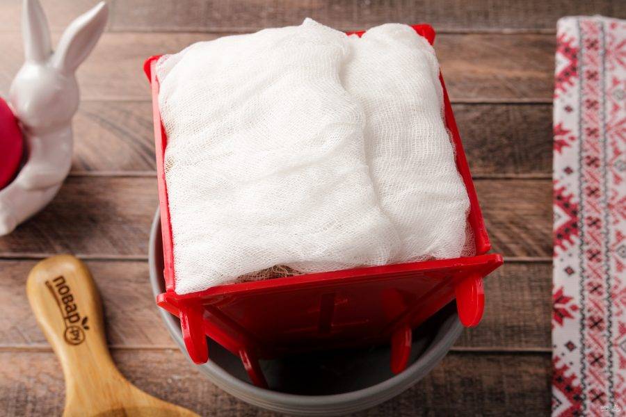 Теперь нам понадобится пасочница или пластиковая баночка с дырками (объемом не более 1 литра, а лучше 750 миллилитров). Размеры моей пасочницы: нижнее основание 12×12 см., верхнее основание 6×6 см., высота 12 см. Соберите её. Поставьте пасочницу на плоскую тарелку, застелите влажной марлей в 2 слоя, стараясь не делать складок.