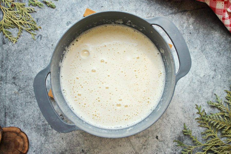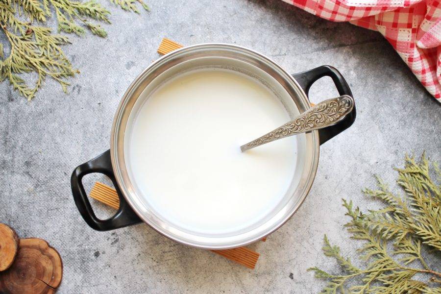 В кастрюлю с толстым дном налейте молоко, добавьте сахар и доведите до кипения и растворения сахара. Снимите кастрюлю с огня.