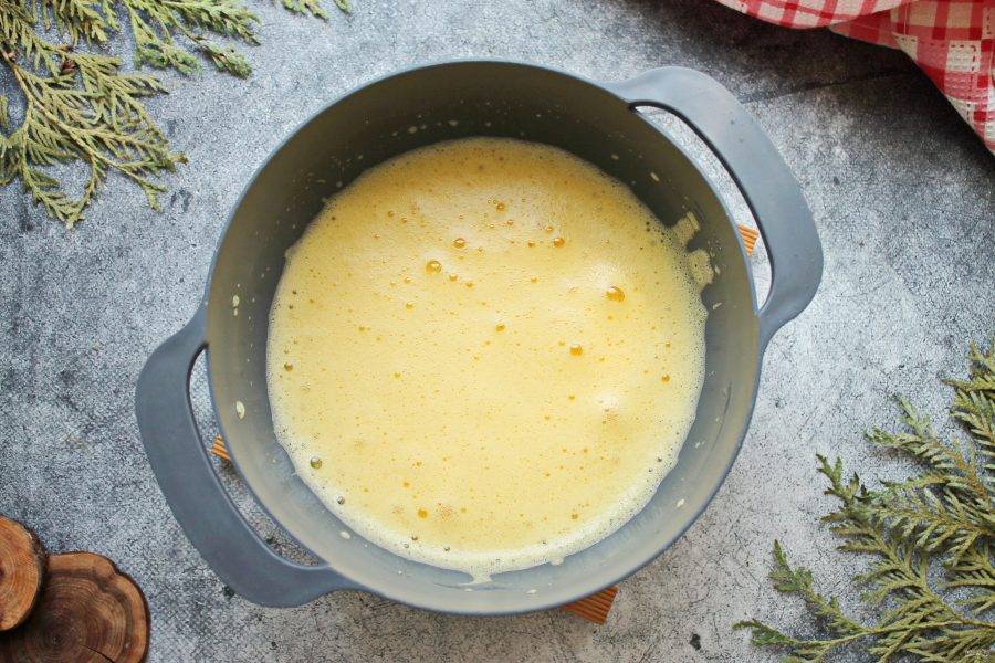 Быстро мешая яичную массу понемногу вливайте горячее молоко. Масса должна быть однородной.