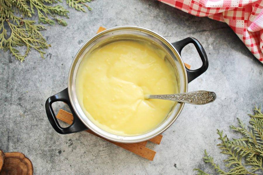 Перелейте яичную массу обратно в кастрюлю и поставьте на медленный огонь. Варите, постоянно мешая до густого состояния. Снимите кастрюлю с огня, выложите пленку на поверхность крема и дайте ему полностью остыть.