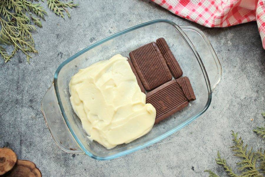 В форму выложите часть шоколадного печенья и покройте частью крема.