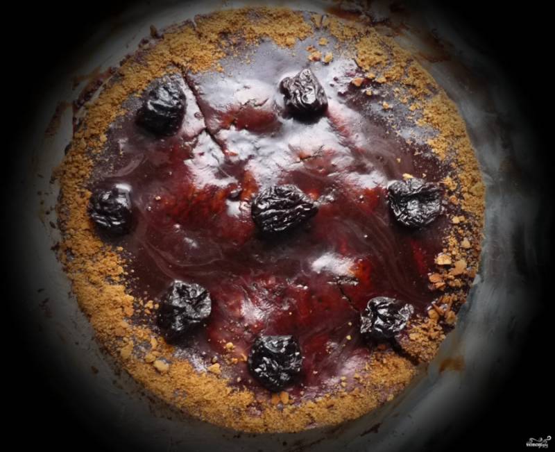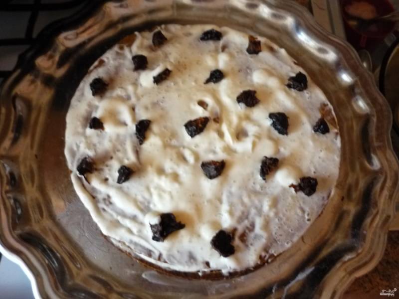 Шоколадную плитку растопите на водяной бане и покройте тонким слоем растопленного шоколада торт. Сверху можете украсить его черносливом. Поставьте торт в холодильник на 2 часа. Этого хватит, чтобы коржи пропитались кремом и стали мягкими.