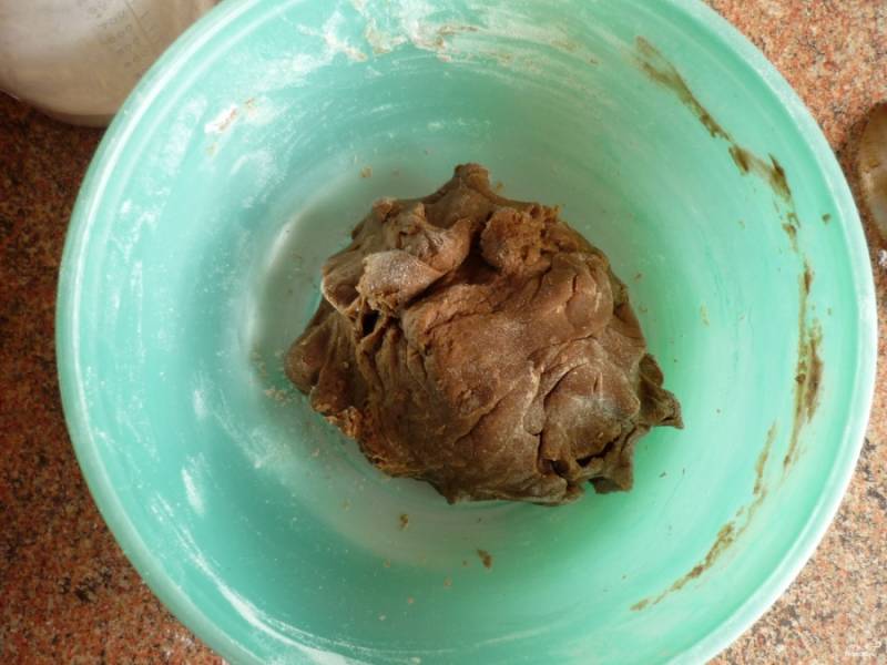 Сначала приготовьте тесто. Для этого смешайте молоко, какао, мёд, 2 столовые ложки сахара и сливочное масло. Поставьте ёмкость с этими ингредиентами на водяную баню и постоянно помешивайте. Нужно, чтобы образовалась однородная масса. В эту массу добавьте муку и соду, вымешайте тесто.