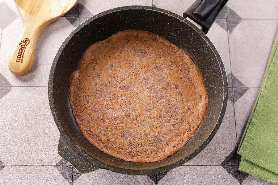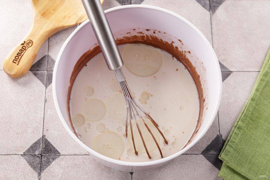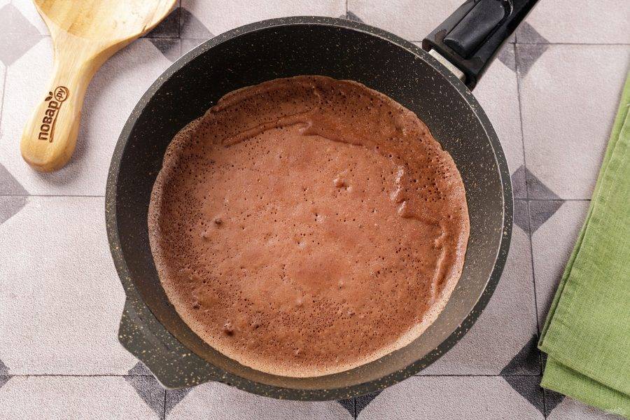 Снова перемешайте тщательно венчиком, чтобы блинное тесто стало однородным. Оставьте тесто для шоколадных блинчиков на столе на 15-20 минут, за это время все ингредиенты вступят в более «тесный контакт». Сковороду слегка смажьте растительным маслом, чтобы первый блин не получился комом.