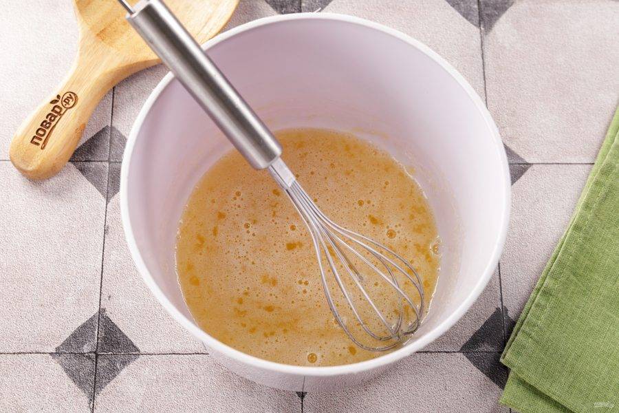 Добавьте соль, сахар и хорошо взбейте венчиком в однородную смесь.