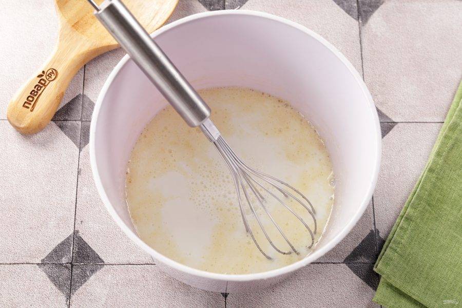 Влейте в миску к яичной смеси половину тёплого молока.