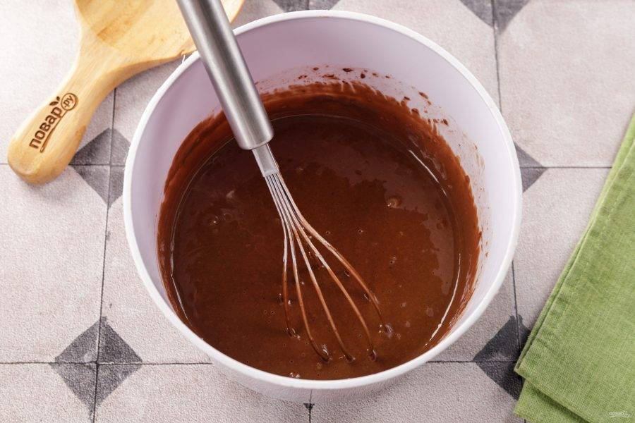 Перемешайте, затем добавьте муку, какао и разрыхлитель.