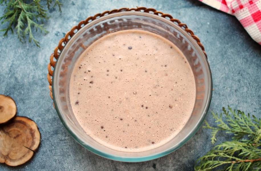 Смешайте муку, какао и разрыхлитель, просейте в молочную массу. Все хорошо перемешайте до однородного теста и дайте постоять 15 минут.