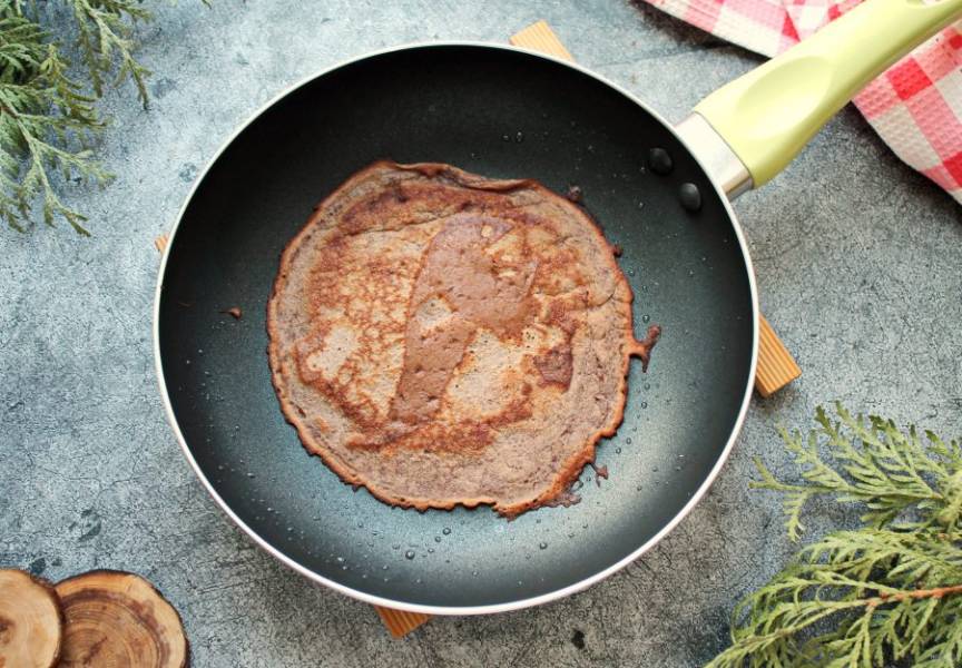 Сковороду разогрейте на медленном огне, смажьте растительным маслом и налейте часть теста, распределив в тонкий блин. Выпекайте с двух сторон до готовности и снимите со сковороды. Испеките так все блины.