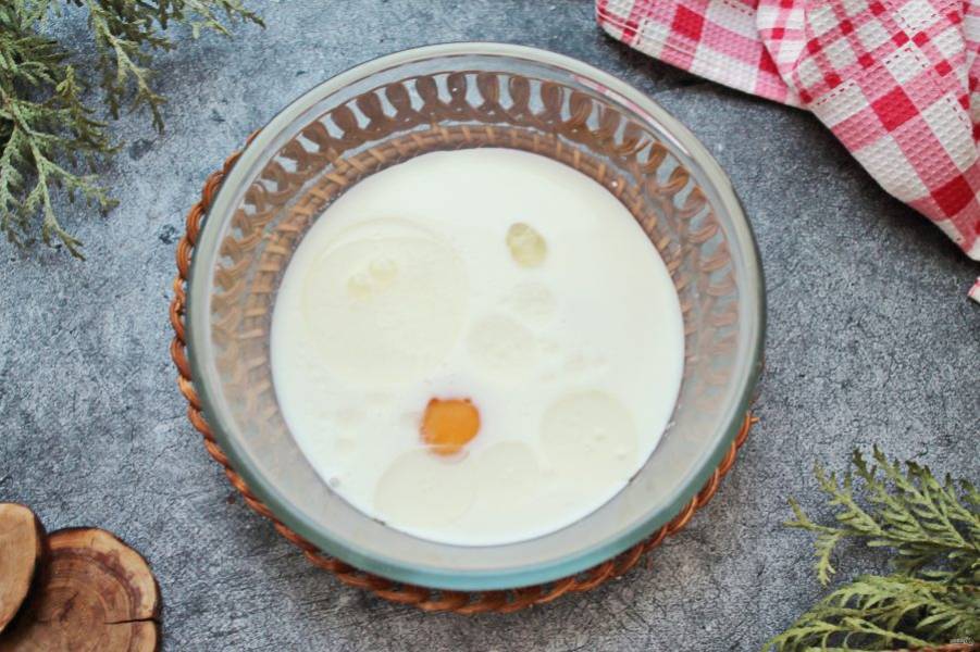 Молоко немного подогрейте, добавьте соль, сахар, растительное масло, ванильный сахар и вбейте яйца. Все хорошо перемешайте до однородности.