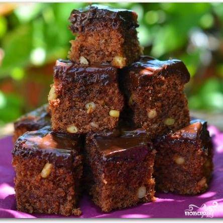 Готовый тортик достаем из духовки и равномерно смазываем шоколадной глазурью.