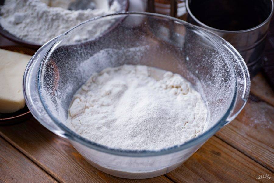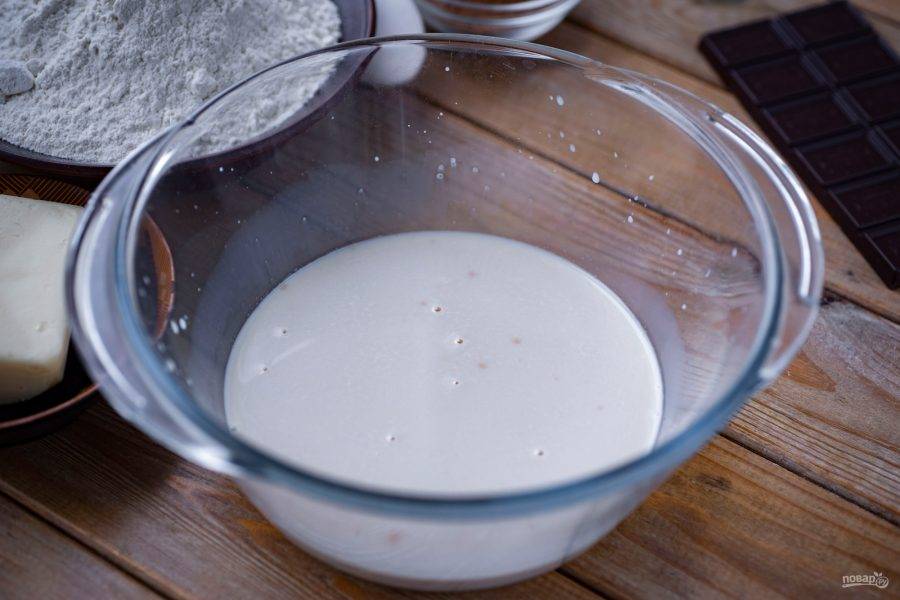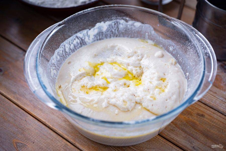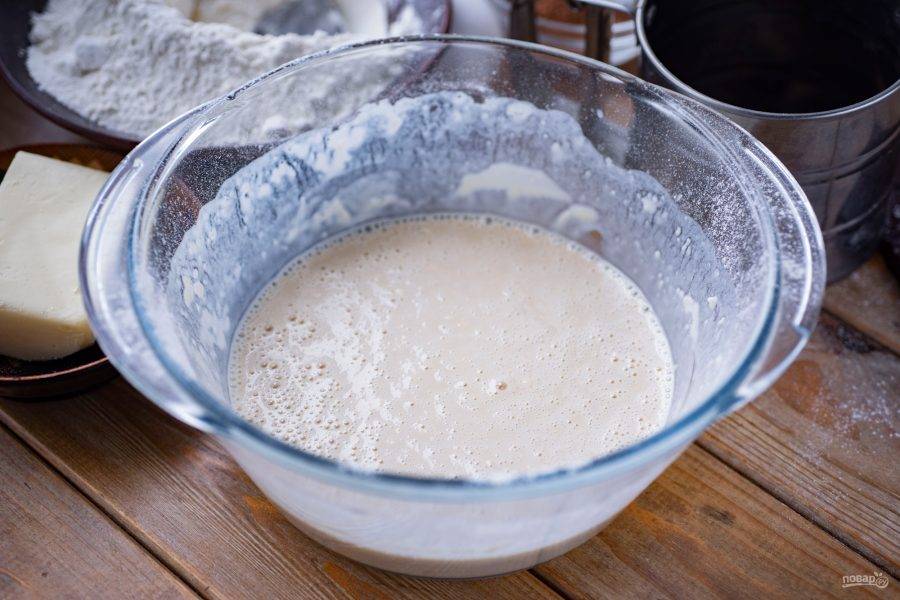Венчиком вмешайте муку до получения однородной смеси, которая по консистенции напоминает блинное тесто — это опара. Миску с опарой накройте кухонным полотенцем и оставьте на 30 минут в покое созревать.