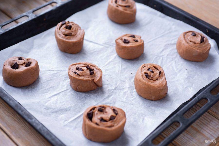 Заготовки будущих шоколадных булочек выложите на противень, застеленный пергаментом для выпекания и отправьте выпекаться в уже разогретую до 180 градусов духовку на 20-25 минут.
