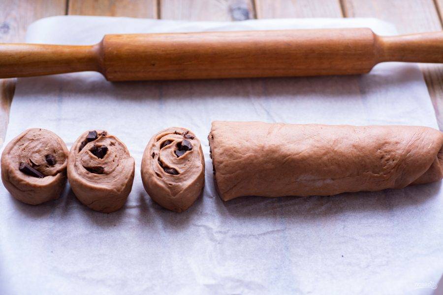 Скрутите тесто с шоколадом рулетиком и нарежьте на одинаковые части.