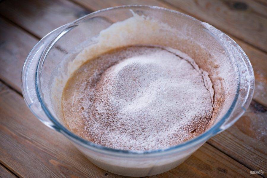 Теперь в эту смесь частями просеивайте муку с какао и по ходу замешивайте тесто сначала ложкой, а затем руками.