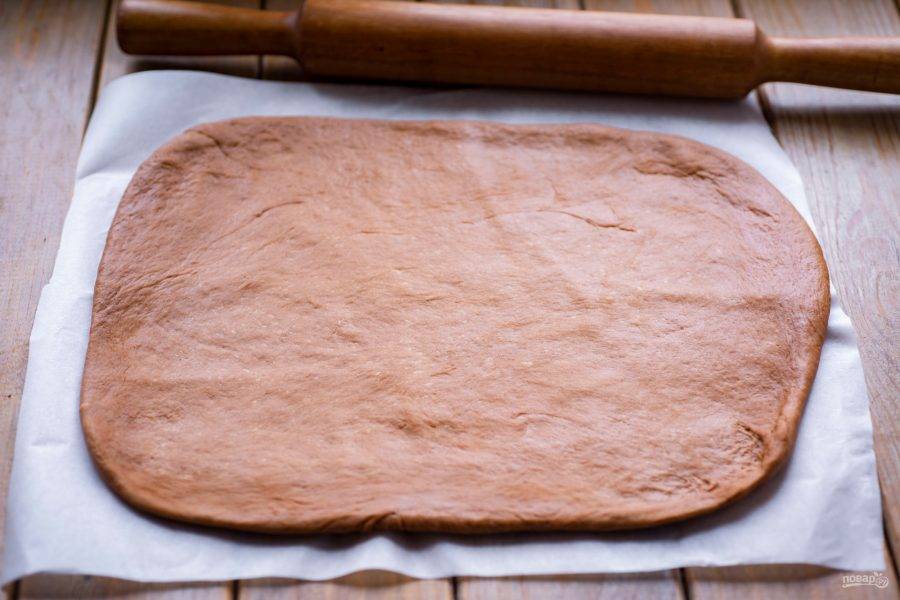 Тесто раскатайте в прямоугольный пласт толщиной в 0,5-0,7 см.