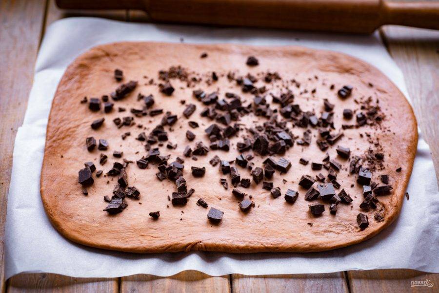 Разложите по тесту кусочки шоколада равномерно.