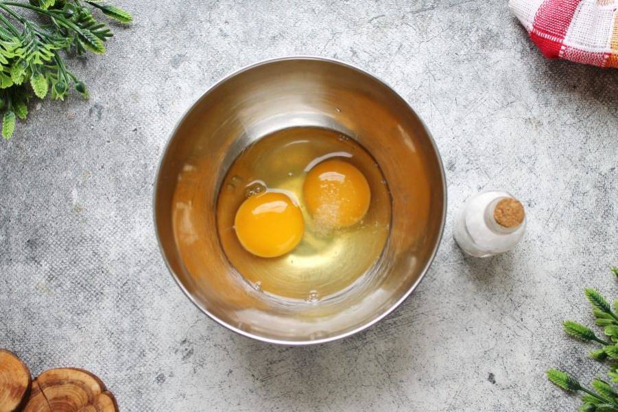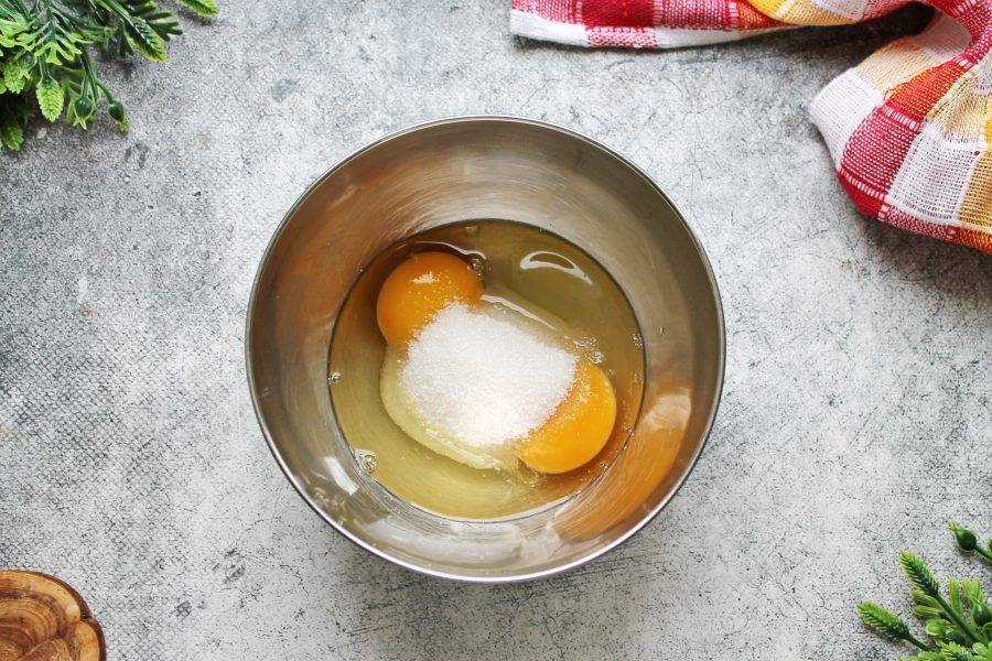Всыпьте в яйца сахар и взбейте миксером до пышной массы.