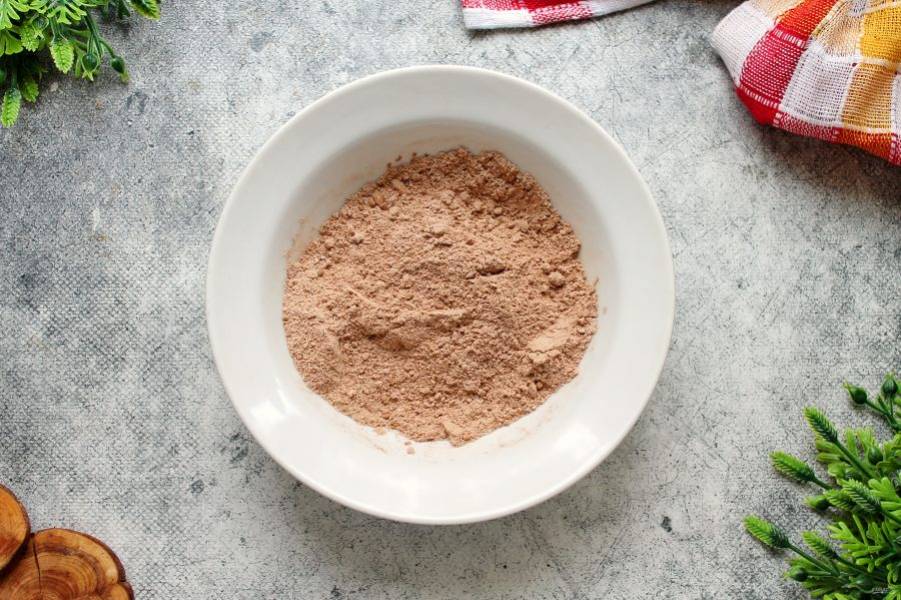 Смешайте пшеничную муку, какао порошок и разрыхлитель, просейте через мелкое сито.