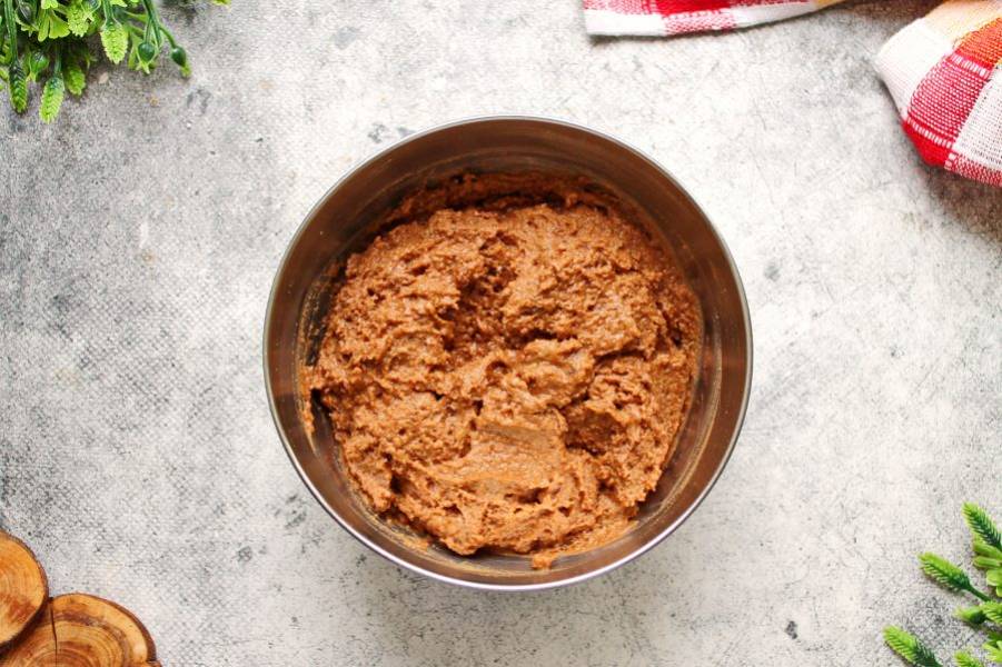 Всыпьте в яичную массу шоколадную муку и хорошо перемешайте лопаткой до образования густого, как густая сметана, теста.