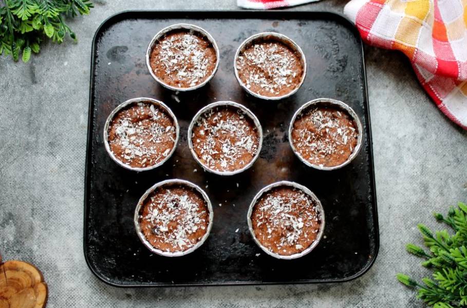 Разложите тесто по формочкам для кексов на 3/4 высоты и разровняйте верх. При желании посыпьте сверху кокосовой стружкой.