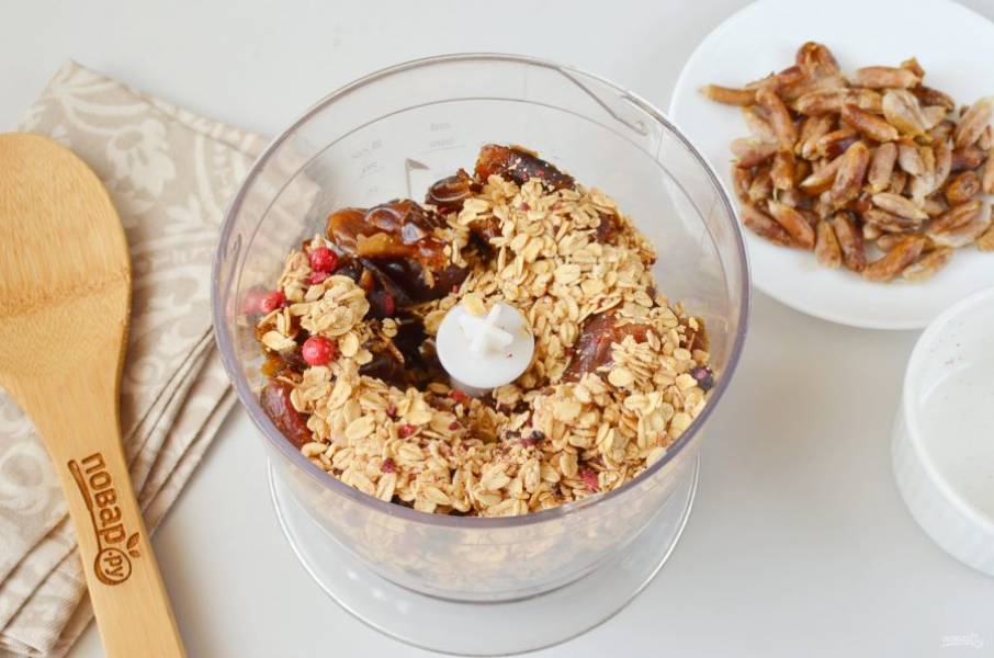 Добавьте гранолу к финикам. Измельчите массу в течение 5-7 минут.