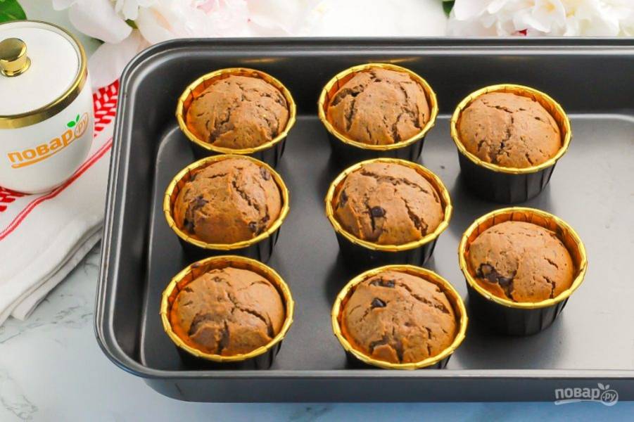 Отправьте заготовки в духовку на 15-20 минут. Когда по кухне поплывет яркий шоколадный аромат, проверьте готовность маффинов деревянной шпажкой, протыкая их в середине. Если она выходит сухой — они полностью готовы.