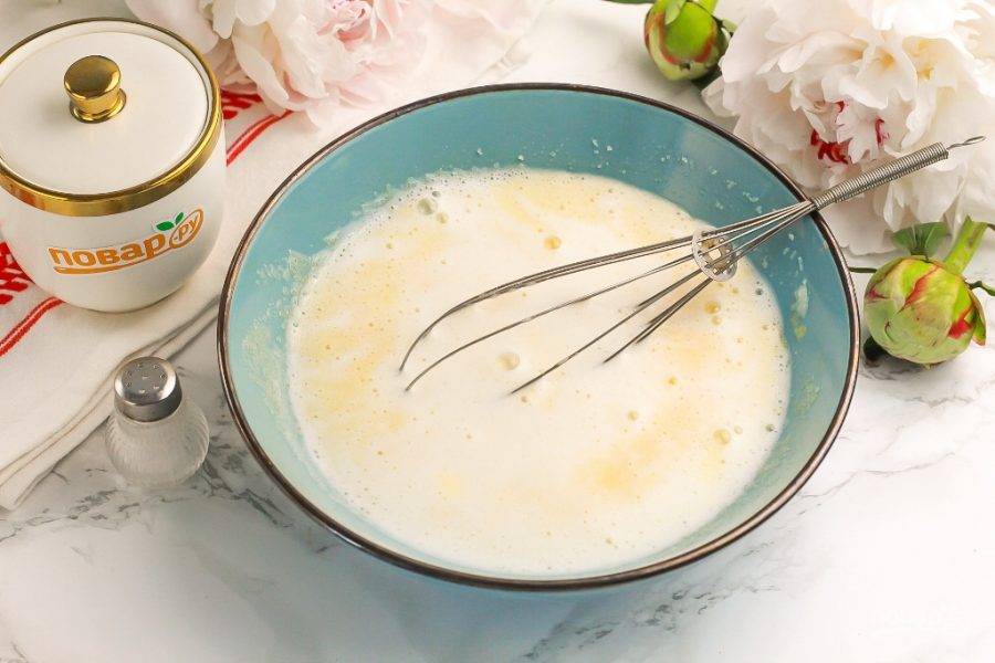 Взбейте все венчиком в течение 2-3 минут. Масса должна слегка побелеть и увеличиться в размерах, а сахар и соль — раствориться.