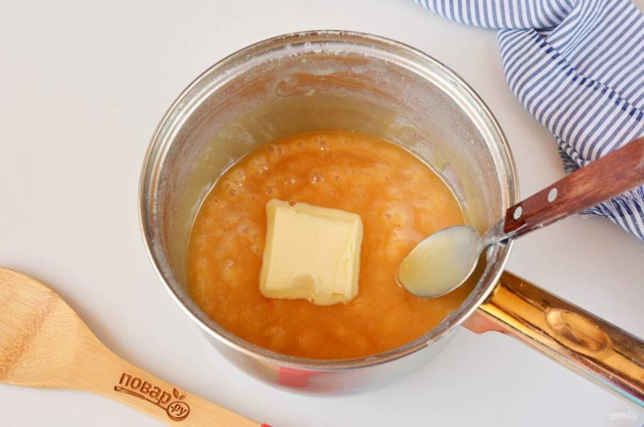 Снимите с огня, добавьте 50-60 грамм сливочного масла. Перемешивайте до тех пор, пока сливочное масло не смешается с карамелью.