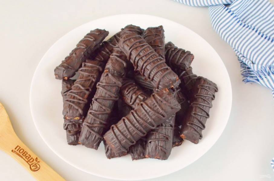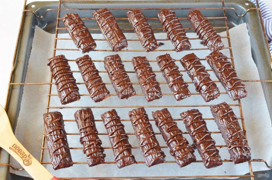 Растопите две плитки шоколада (можно взять любой, на свой вкус, у меня черный), силиконовой кисточкой нанесите шоколад на батончики или просто окунайте в шоколад. Остатки шоколада можно охладить для следующего рецепта, а можно перенести его в пакетик и украсить сверху батончики.