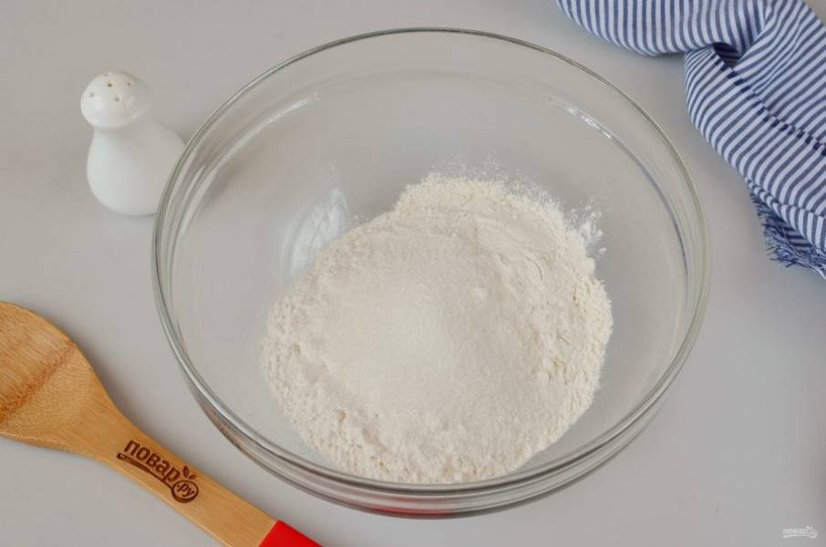 Первым делом нужно приготовить основу для батончиков. Смешайте муку с сахаром и щепоткой соли.
