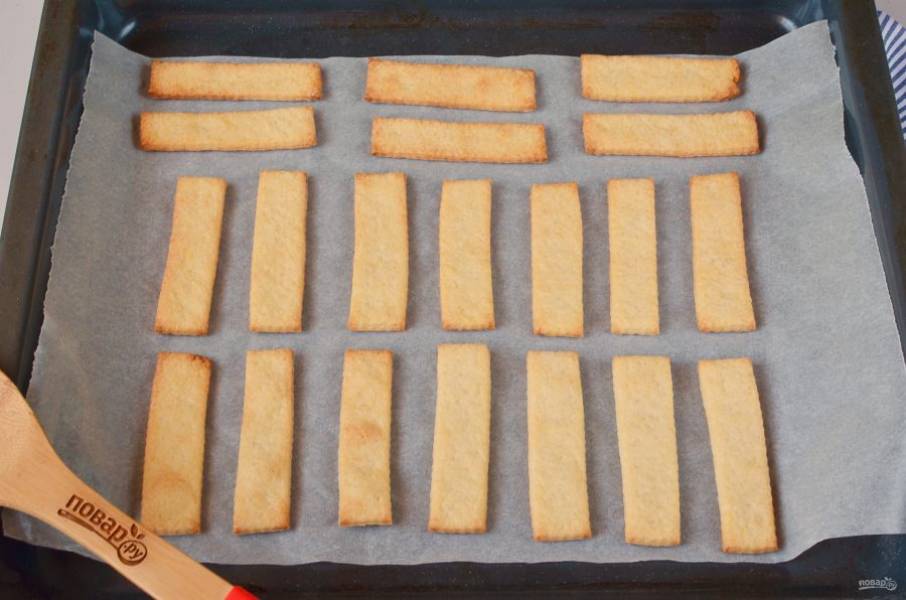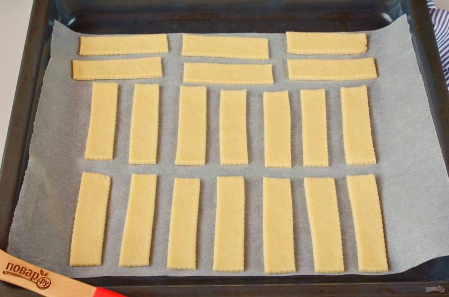 Раскатайте тесто так, чтобы порезать его на 20-25 тонких полосочек, ширина 1,5-2 см. Выложите на пергамент и отправьте в холодильник на 30 минут. За это время разогрейте духовку до 180 градусов.