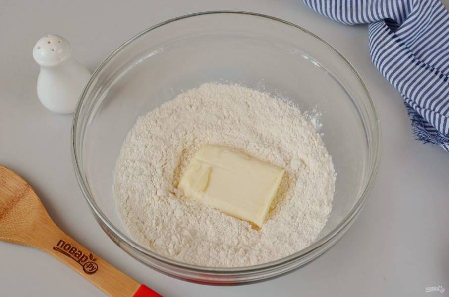 Добавьте холодное масло и вилочкой или ножом смешайте его с мукой, чтобы образовались мелкие крошки.