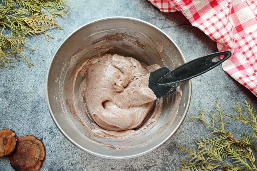 Смешайте муку с какао порошком и дважды просейте через сито. Это поможет избавиться от мусора, если такой был и обогатить муку воздухом. Введите шоколадную муку во взбитые белки и аккуратно сверху вниз перемешайте.