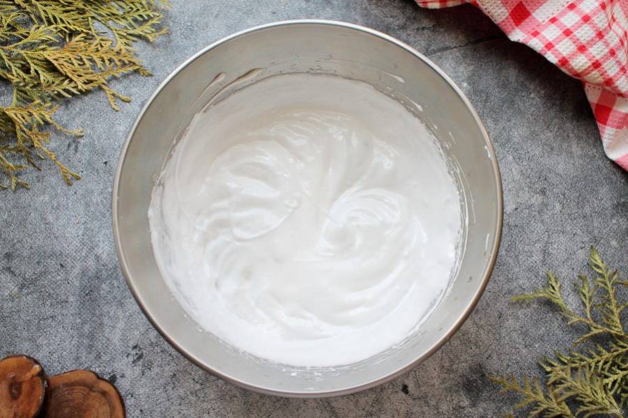 Продолжая взбивать белки, частями всыпайте сахар. Взбивайте все до растворения сахара и мягких пиков. Это значит масса должна свисать с венчика в виде клюва, а не стоять столбом.