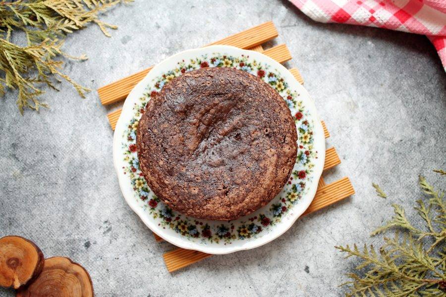 Готовый бисквит достаньте из духовки и переверните на решетку для выпечки. Если ее нет, то установите ее вверх дном на чашки, главное чтобы было пространство снизу.