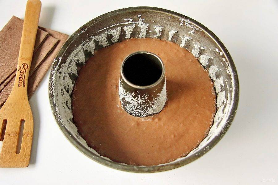 Перемешайте все до однородного состояния и вылейте тесто в смазанную маслом форму для выпечки. Дно и бока формы предварительно смажьте маслом и обсыпьте мукой или манкой.